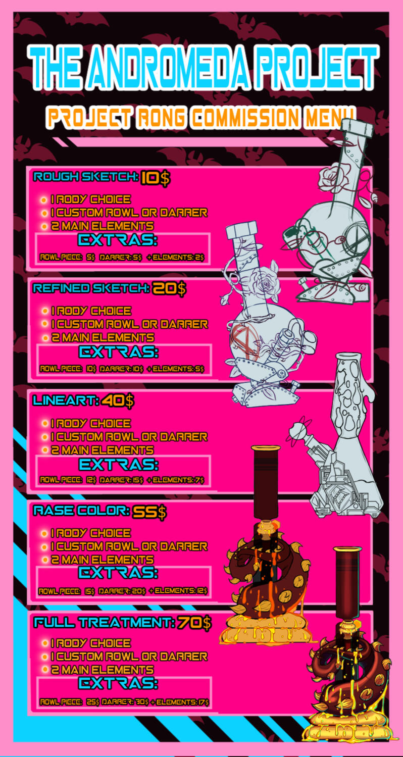 Delivery time is 1-4 weeks depending on the size of the piece and queue position.Approximate delivery time will begin after current commission is done.My situation may change delivery time, despite everything I am human. When discussing commission details I will update and inform on expected delivery time.Regular updates will be provided through out the process of the commission.During sketching and lineart up to three (3) revisions will be accepted. After that additional fees apply.Commissions are for personal use ONLY unless otherwise paid for.Commercial prices are built into the base price of bongs.For commercial use, prices vary depending on the commission and usage. Please askIf you decide to buy the commercial rights any point in time after the completion of the commission, you are more than welcome to come back and inquireCommissions $100+, Half payment upfront may be accepted but remaining fee must be paid before receiving finished commissionCommissions $100+, An extra fee may be asked to help partially cover Paypal fees.Tips are never necessary but greatly appreciated!!